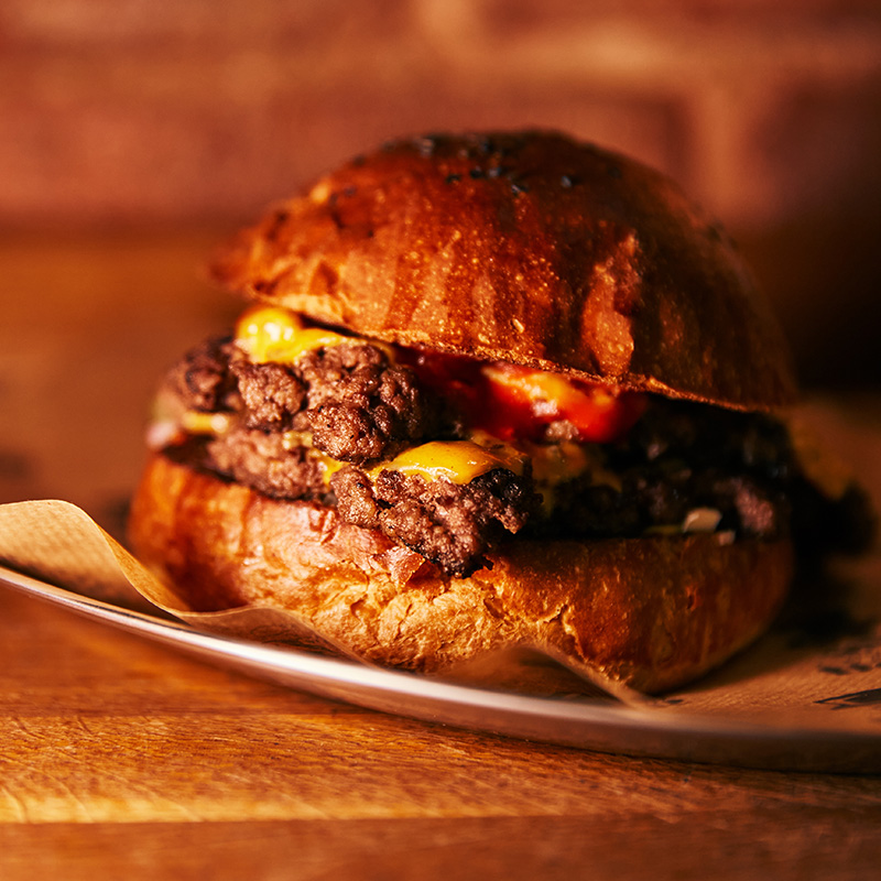 Bułka pszenna / dwa kotlety wołowe / Ser Cheddar / szalotka / ogórek kiszony / ketchup / musztarda