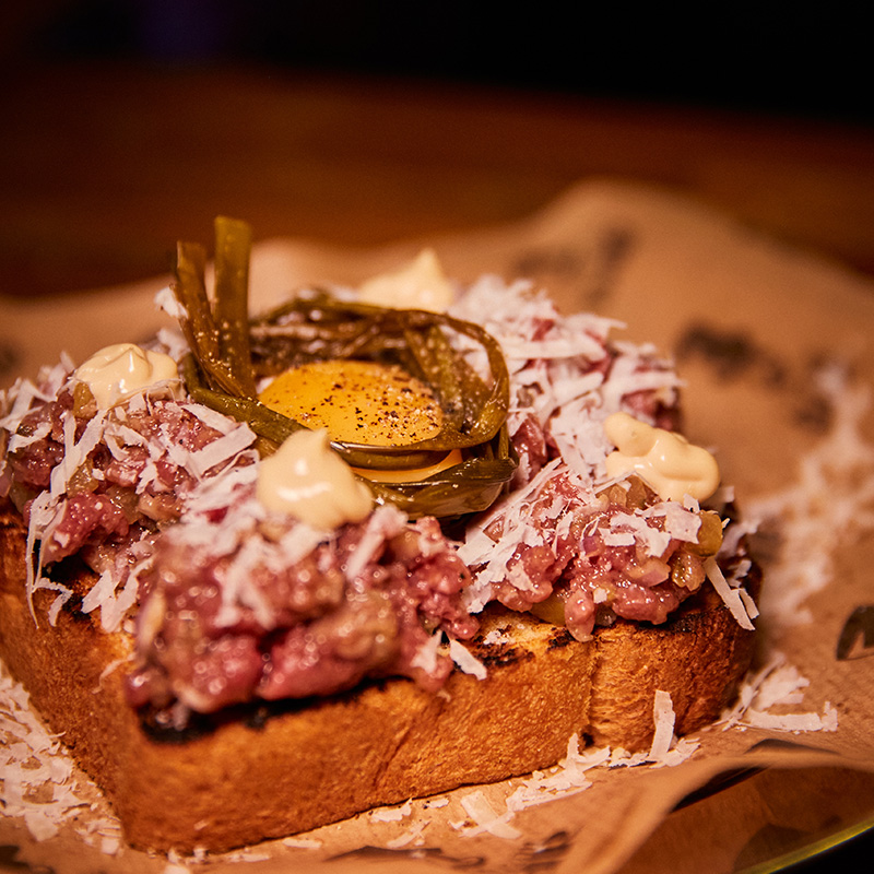 Szałotka / marynowany szczypiorek / ogórek kiszony / mayo teriyaki / żółtko / Pecorino / shokupan