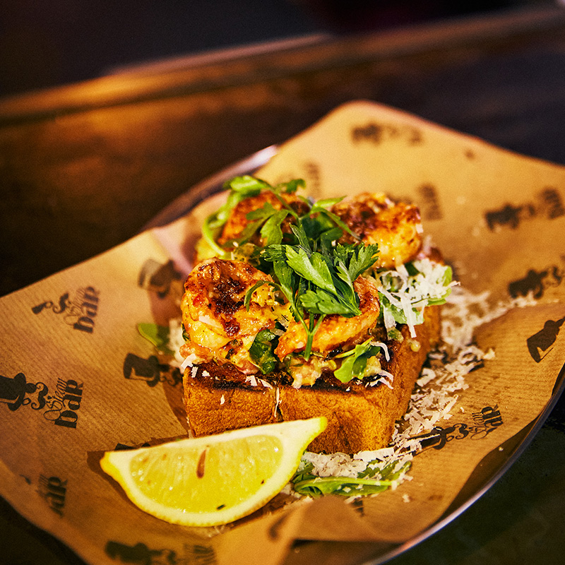 Krewetki / pasta awokado / natka pietruszki / czosnek / rukola / parmezan / chilli / shokupan